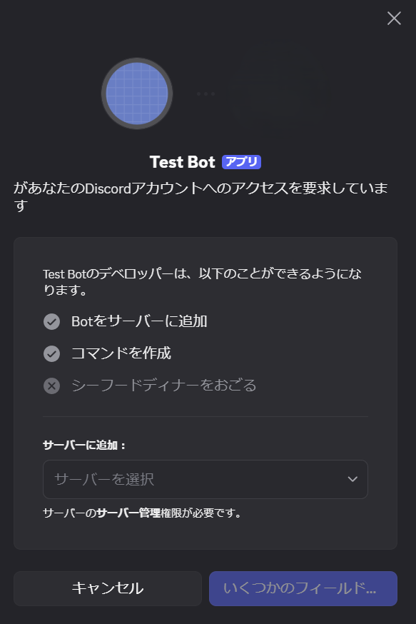 できたURLにアクセスするとDiscordでBot追加のページが立ち上がります。