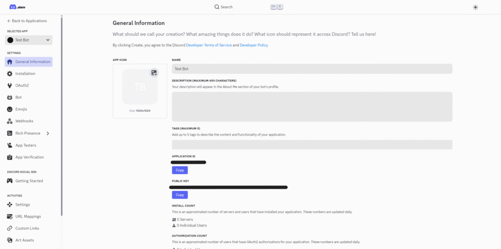 作成が完了すると、アプリケーションの管理画面に移動します。ここではBotのアイコンや説明文を設定できます。