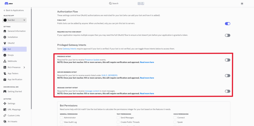- SERVER MEMBERS INTENT: サーバーに参加しているメンバーの一覧などを取得するために必要です。