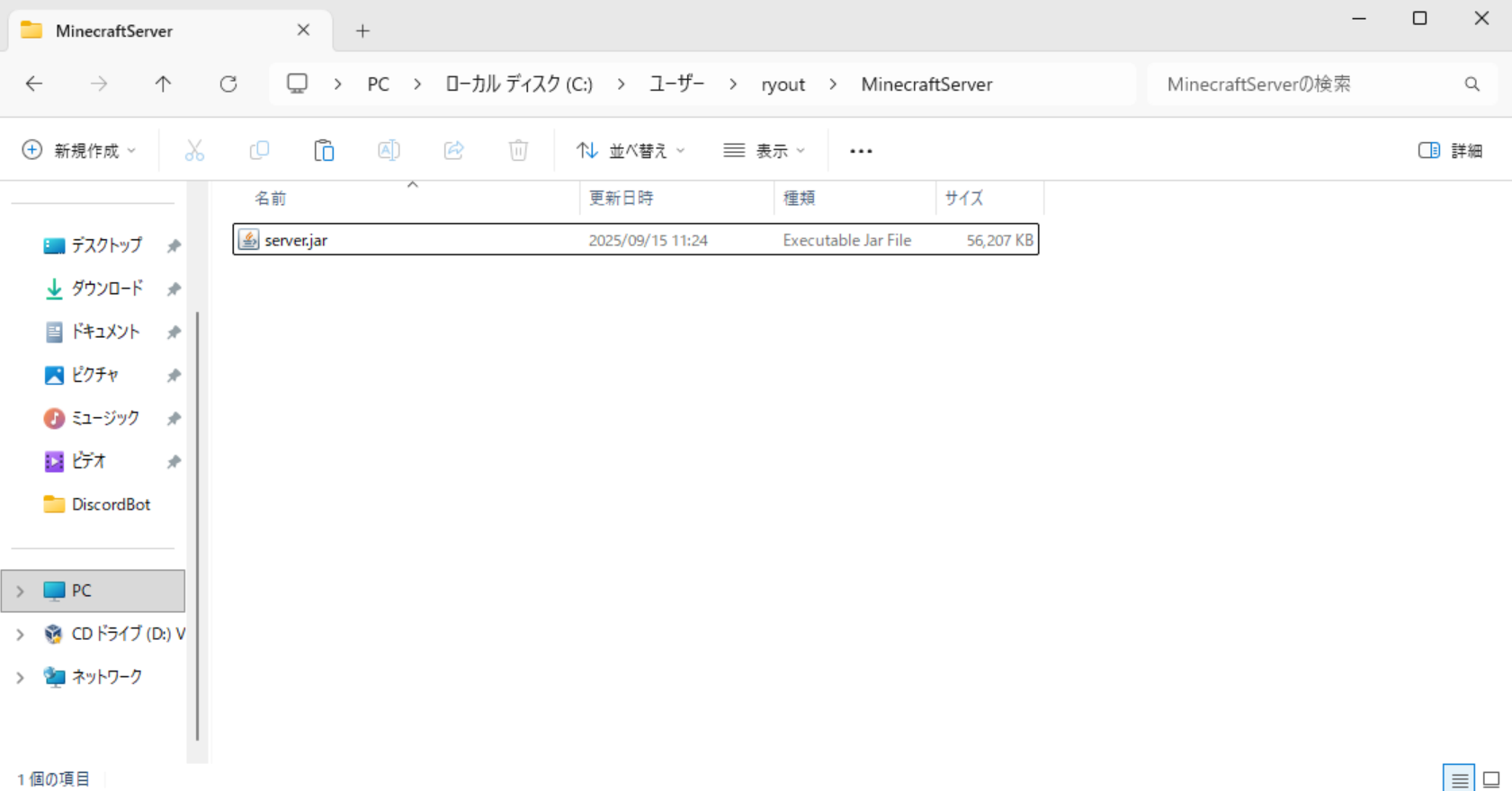 作成したサーバー用フォルダの中で、ダウンロードした.jar